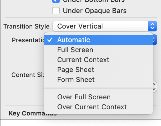 xcode 11부터 빌드시에 Automatic의 기본값이 Full Screen이 아닌 Page Sheet가 되었습니다.