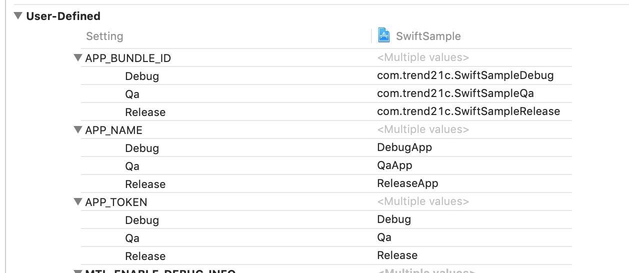 Build Settings 탭으로 이동하면 하단에 User-Defined 라는 항목에 내가 configuration 파일에 추가한 변수들과 값을 확인할 수 있습니다.