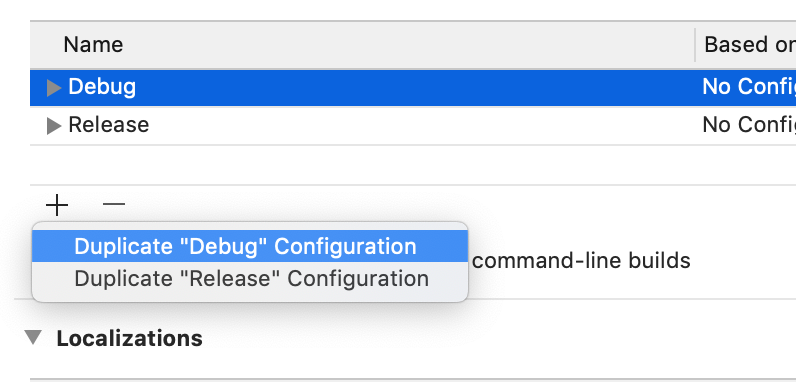 configuration을 추가한 다음에 build settings 탭을 클릭해서 값들을 열어보시면