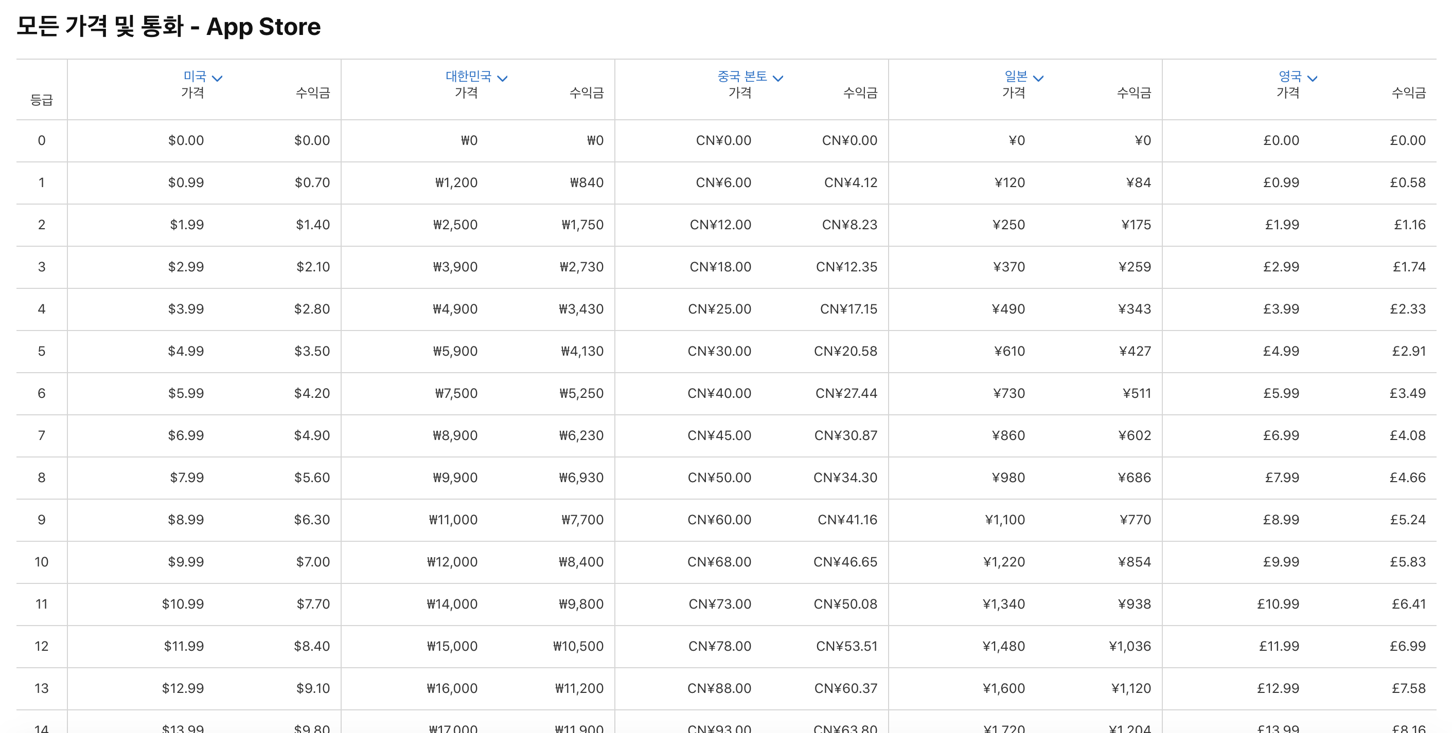 애플이 제공하는 인앱 구매 상품 가격 테이블이 나와있는 URL입니다