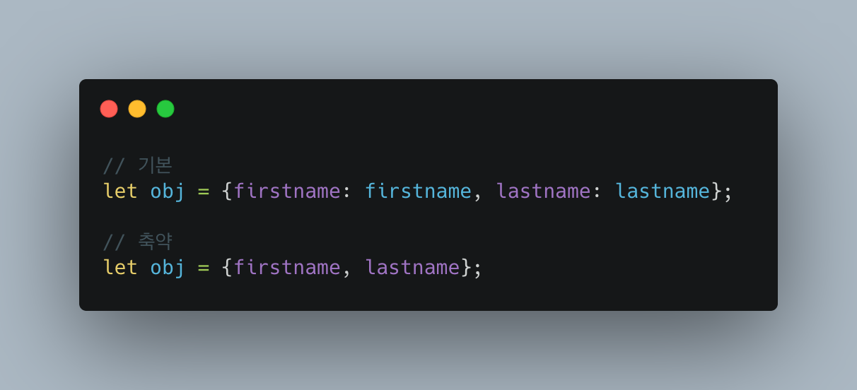 object를 선언할때 프로퍼티명과 값이 동일한 경우에는 한번만 입력해도 됩니다