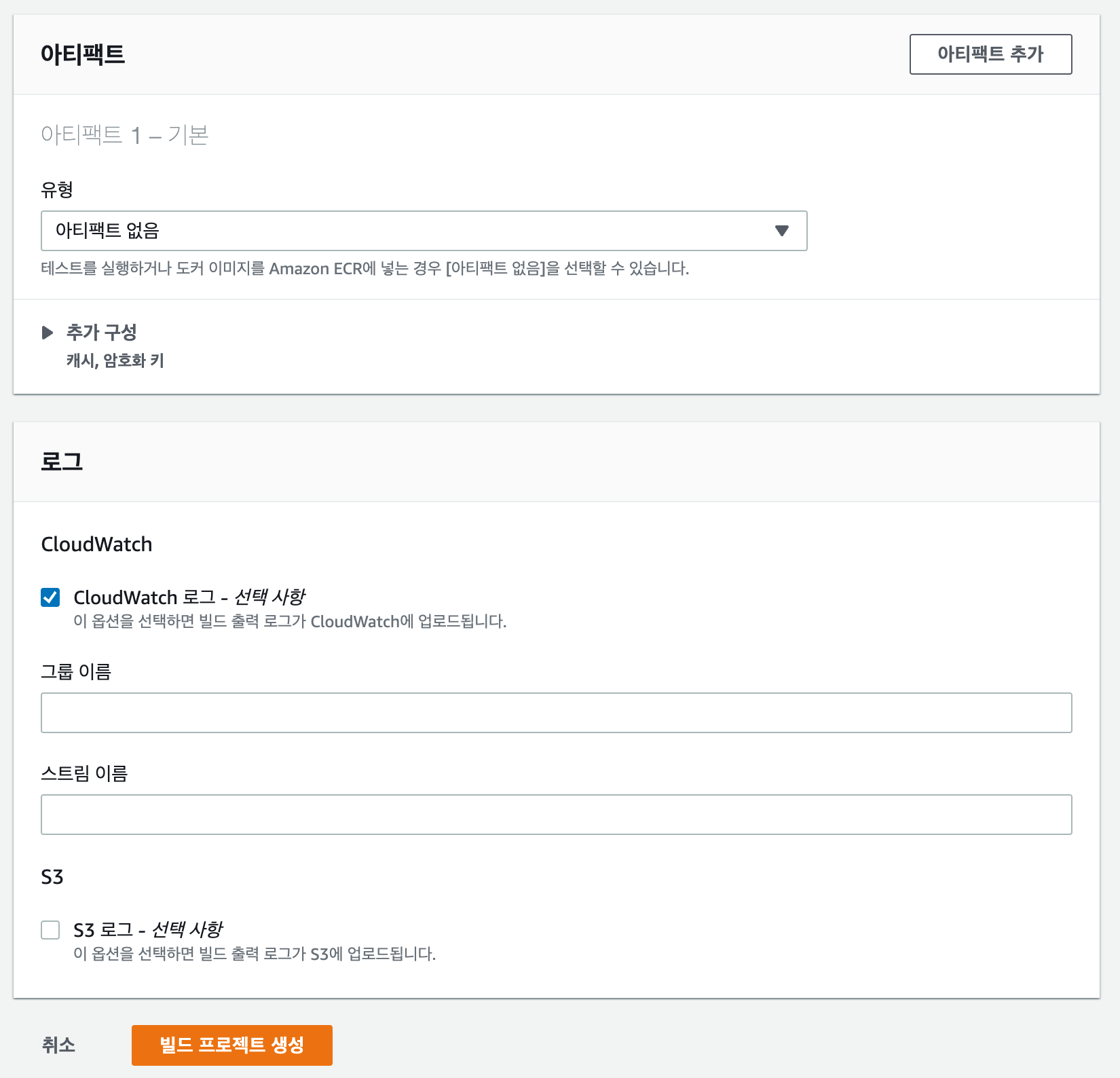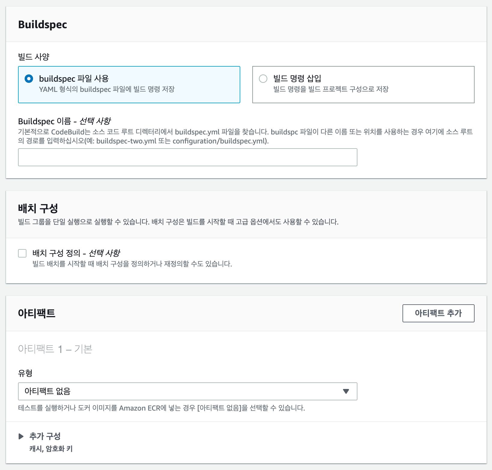 아티팩트는 buildspec에서도 지정을 할 수 있으므로, 여기서는 아티팩트 없음을 선택하셔도 됩니다