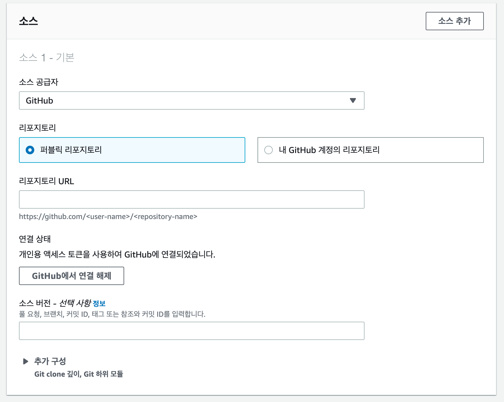 개인프로젝트라면 "내 GitHub 계정의 리포지토리"를 선택하고 github 계정을 연결하는 절차를 진행해야합니다