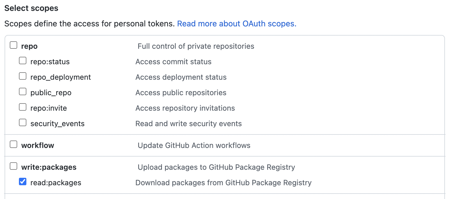 패키지를 설치만할것이기 때문에 read:packages권한만 있으면 됩니다