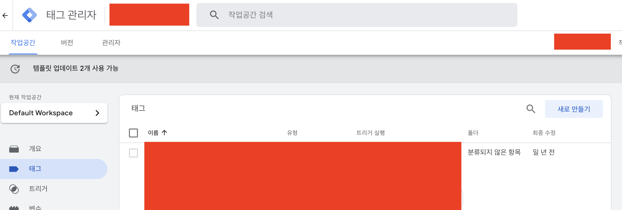 구글 태그 관리자에서 태그를 선택하시고 "새로 만들기"를 눌러주세요